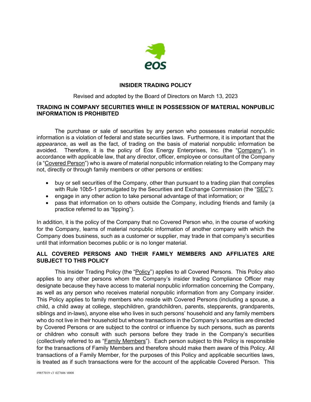 Eos Energy Enterprises, Inc. (NASDAQ: EOSE) (“Eos”, “we,” “us,” “our,” or “Company”) is an American energy company and America’s leading innovator in designing, manufacturing, and providing zinc-based battery energy storage systems ("BESS"), sourced, and manufactured in the United States. The Eos BESS are safe, non-flammable, secure, and sustainable alternatives to lithium-ion batteries, making them ideal for utility-scale, microgrid, and commercial and industrial long-duration applications.