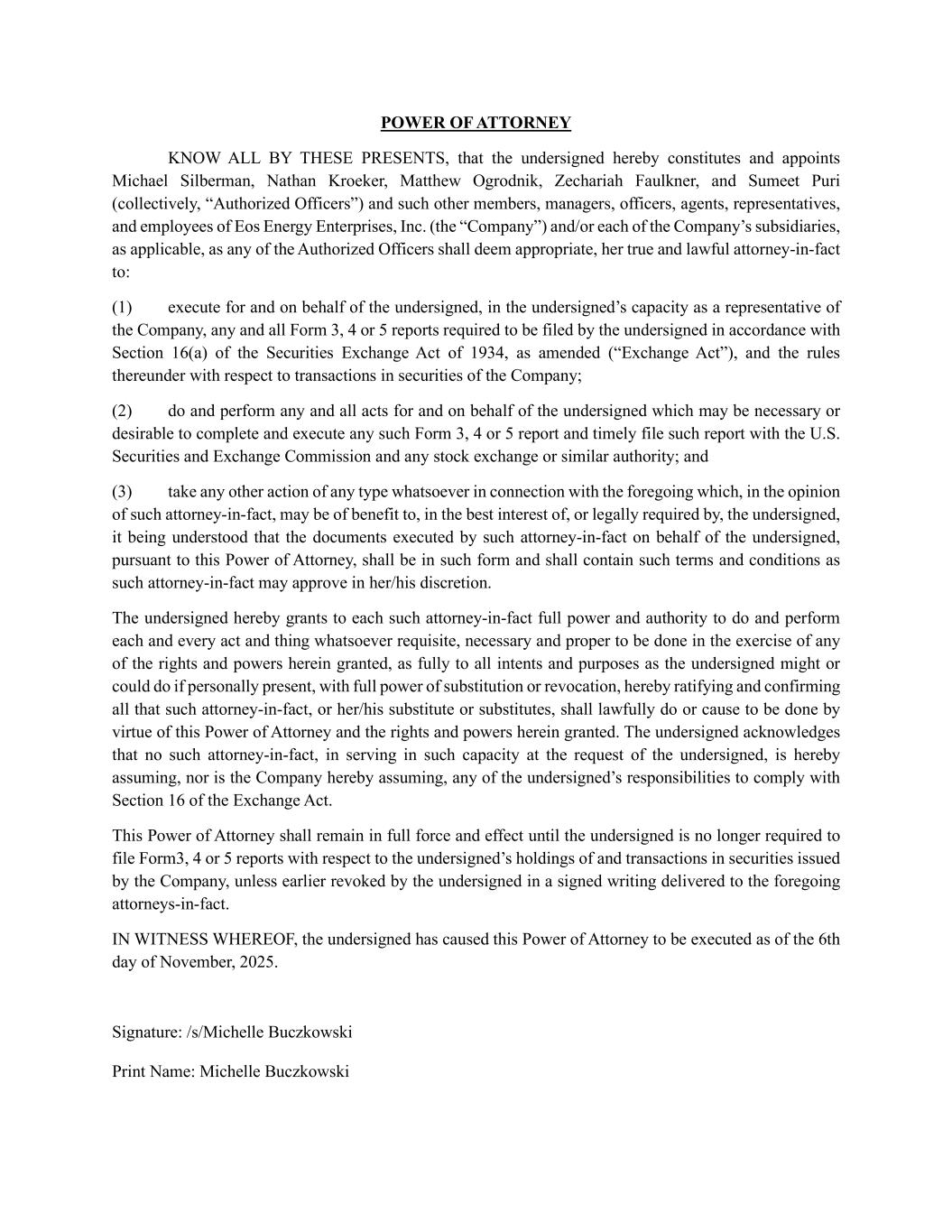 POWER OF ATTORNEY KNOW ALL BY THESE PRESENTS, that the undersigned hereby constitutes and appoints Michael Silberman, Nathan Kroeker, Matthew Ogrodnik, Zechariah Faulkner, and Sumeet Puri (collectively, “Authorized Officers”) and such other members, managers, officers, agents, representatives, and employees of Eos Energy Enterprises, Inc. (the “Company”) and/or each of the Company’s subsidiaries, as applicable, as any of the Authorized Officers shall deem appropriate, her true and lawful attorney-in-fact to: (1) execute for and on behalf of the undersigned, in the undersigned’s capacity as a representative of the Company, any and all Form 3, 4 or 5 reports required to be filed by the undersigned in accordance with Section 16(a) of the Securities Exchange Act of 1934, as amended (“Exchange Act”), and the rules thereunder with respect to transactions in securities of the Company; (2) do and perform any and all acts for and on behalf of the undersigned which may be necessary or desirable to complete and execute any such Form 3, 4 or 5 report and timely file such report with the U.S. Securities and Exchange Commission and any stock exchange or similar authority; and (3) take any other action of any type whatsoever in connection with the foregoing which, in the opinion of such attorney-in-fact, may be of benefit to, in the best interest of, or legally required by, the undersigned, it being understood that the documents executed by such attorney-in-fact on behalf of the undersigned, pursuant to this Power of Attorney, shall be in such form and shall contain such terms and conditions as such attorney-in-fact may approve in her/his discretion. The undersigned hereby grants to each such attorney-in-fact full power and authority to do and perform each and every act and thing whatsoever requisite, necessary and proper to be done in the exercise of any of the rights and powers herein granted, as fully to all intents and purposes as the undersigned might or could do if personally present, with full power of substitution or revocation, hereby ratifying and confirming all that such attorney-in-fact, or her/his substitute or substitutes, shall lawfully do or cause to be done by virtue of this Power of Attorney and the rights and powers herein granted. The undersigned acknowledges that no such attorney-in-fact, in serving in such capacity at the request of the undersigned, is hereby assuming, nor is the Company hereby assuming, any of the undersigned’s responsibilities to comply with Section 16 of the Exchange Act. This Power of Attorney shall remain in full force and effect until the undersigned is no longer required to file Form3, 4 or 5 reports with respect to the undersigned’s holdings of and transactions in securities issued by the Company, unless earlier revoked by the undersigned in a signed writing delivered to the foregoing attorneys-in-fact. IN WITNESS WHEREOF, the undersigned has caused this Power of Attorney to be executed as of the 6th day of November, 2025. Signature: /s/Michelle Buczkowski Print Name: Michelle Buczkowski