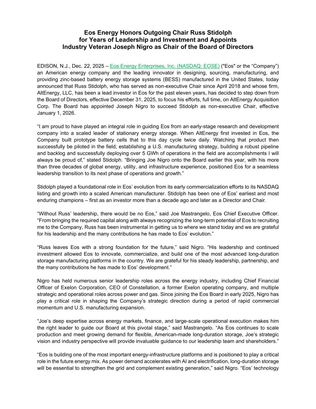 Eos Energy Honors Outgoing Chair Russ Stidolph for Years of Leadership and Investment and Appoints Industry Veteran Joseph Nigro as Chair of the Board of Directors EDISON, N.J., Dec. 22, 2025 – Eos Energy Enterprises, Inc. (NASDAQ: EOSE) ("Eos" or the “Company”) an American energy company and the leading innovator in designing, sourcing, manufacturing, and providing zinc-based battery energy storage systems (BESS) manufactured in the United States, today announced that Russ Stidolph, who has served as non-executive Chair since April 2018 and whose firm, AltEnergy, LLC, has been a lead investor in Eos for the past eleven years, has decided to step down from the Board of Directors, effective December 31, 2025, to focus his efforts, full time, on AltEnergy Acquisition Corp. The Board has appointed Joseph Nigro to succeed Stidolph as non-executive Chair, effective January 1, 2026. “I am proud to have played an integral role in guiding Eos from an early-stage research and development company into a scaled leader of stationary energy storage. When AltEnergy first invested in Eos, the Company built prototype battery cells that to this day cycle twice daily. Watching that product then successfully be piloted in the field, establishing a U.S. manufacturing strategy, building a robust pipeline and backlog and successfully deploying over 5 GWh of operations in the field are accomplishments I will always be proud of,” stated Stidolph. “Bringing Joe Nigro onto the Board earlier this year, with his more than three decades of global energy, utility, and infrastructure experience, positioned Eos for a seamless leadership transition to its next phase of operations and growth.” Stidolph played a foundational role in Eos’ evolution from its early commercialization efforts to its NASDAQ listing and growth into a scaled American manufacturer. Stidolph has been one of Eos’ earliest and most enduring champions – first as an investor more than a decade ago and later as a Director and Chair. “Without Russ’ leadership, there would be no Eos,” said Joe Mastrangelo, Eos Chief Executive Officer. “From bringing the required capital along with always recognizing the long-term potential of Eos to recruiting me to the Company, Russ has been instrumental in getting us to where we stand today and we are grateful for his leadership and the many contributions he has made to Eos’ evolution.” “Russ leaves Eos with a strong foundation for the future,” said Nigro. “His leadership and continued investment allowed Eos to innovate, commercialize, and build one of the most advanced long-duration storage manufacturing platforms in the country. We are grateful for his steady leadership, partnership, and the many contributions he has made to Eos’ development.” Nigro has held numerous senior leadership roles across the energy industry, including Chief Financial Officer of Exelon Corporation, CEO of Constellation, a former Exelon operating company, and multiple strategic and operational roles across power and gas. Since joining the Eos Board in early 2025, Nigro has play a critical role in shaping the Company’s strategic direction during a period of rapid commercial momentum and U.S. manufacturing expansion. “Joe’s deep expertise across energy markets, finance, and large-scale operational execution makes him the right leader to guide our Board at this pivotal stage,” said Mastrangelo. “As Eos continues to scale production and meet growing demand for flexible, American-made long-duration storage, Joe’s strategic vision and industry perspective will provide invaluable guidance to our leadership team and shareholders.” “Eos is building one of the most important energy-infrastructure platforms and is positioned to play a critical role in the future energy mix. As power demand accelerates with AI and electrification, long-duration storage will be essential to strengthen the grid and complement existing generation,” said Nigro. “Eos’ technology