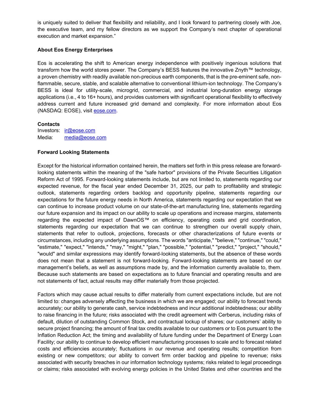 is uniquely suited to deliver that flexibility and reliability, and I look forward to partnering closely with Joe, the executive team, and my fellow directors as we support the Company’s next chapter of operational execution and market expansion.” About Eos Energy Enterprises Eos is accelerating the shift to American energy independence with positively ingenious solutions that transform how the world stores power. The Company’s BESS features the innovative Znyth™ technology, a proven chemistry with readily available non-precious earth components, that is the pre-eminent safe, non- flammable, secure, stable, and scalable alternative to conventional lithium-ion technology. The Company’s BESS is ideal for utility-scale, microgrid, commercial, and industrial long-duration energy storage applications (i.e., 4 to 16+ hours), and provides customers with significant operational flexibility to effectively address current and future increased grid demand and complexity. For more information about Eos (NASDAQ: EOSE), visit eose.com. Contacts Investors: ir@eose.com Media: media@eose.com Forward Looking Statements Except for the historical information contained herein, the matters set forth in this press release are forward- looking statements within the meaning of the "safe harbor" provisions of the Private Securities Litigation Reform Act of 1995. Forward-looking statements include, but are not limited to, statements regarding our expected revenue, for the fiscal year ended December 31, 2025, our path to profitability and strategic outlook, statements regarding orders backlog and opportunity pipeline, statements regarding our expectations for the future energy needs in North America, statements regarding our expectation that we can continue to increase product volume on our state-of-the-art manufacturing line, statements regarding our future expansion and its impact on our ability to scale up operations and increase margins, statements regarding the expected impact of DawnOS™ on efficiency, operating costs and grid coordination, statements regarding our expectation that we can continue to strengthen our overall supply chain, statements that refer to outlook, projections, forecasts or other characterizations of future events or circumstances, including any underlying assumptions. The words "anticipate," "believe," "continue," "could," "estimate," "expect," "intends," "may," "might," "plan," "possible," "potential," "predict," "project," "should," "would" and similar expressions may identify forward-looking statements, but the absence of these words does not mean that a statement is not forward-looking. Forward-looking statements are based on our management’s beliefs, as well as assumptions made by, and the information currently available to, them. Because such statements are based on expectations as to future financial and operating results and are not statements of fact, actual results may differ materially from those projected. Factors which may cause actual results to differ materially from current expectations include, but are not limited to: changes adversely affecting the business in which we are engaged; our ability to forecast trends accurately; our ability to generate cash, service indebtedness and incur additional indebtedness; our ability to raise financing in the future; risks associated with the credit agreement with Cerberus, including risks of default, dilution of outstanding Common Stock, and contractual lockup of shares; our customers’ ability to secure project financing; the amount of final tax credits available to our customers or to Eos pursuant to the Inflation Reduction Act; the timing and availability of future funding under the Department of Energy Loan Facility; our ability to continue to develop efficient manufacturing processes to scale and to forecast related costs and efficiencies accurately; fluctuations in our revenue and operating results; competition from existing or new competitors; our ability to convert firm order backlog and pipeline to revenue; risks associated with security breaches in our information technology systems; risks related to legal proceedings or claims; risks associated with evolving energy policies in the United States and other countries and the