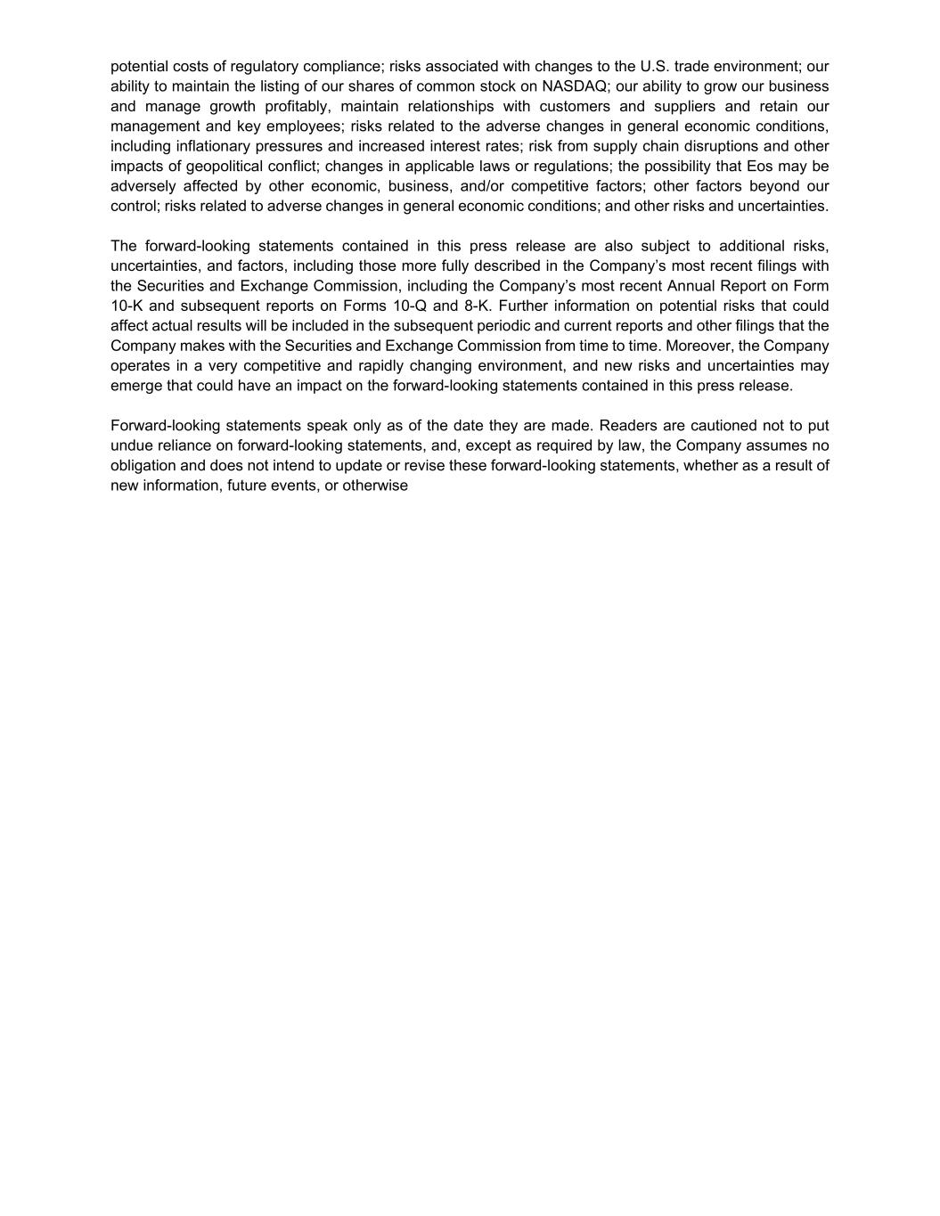 potential costs of regulatory compliance; risks associated with changes to the U.S. trade environment; our ability to maintain the listing of our shares of common stock on NASDAQ; our ability to grow our business and manage growth profitably, maintain relationships with customers and suppliers and retain our management and key employees; risks related to the adverse changes in general economic conditions, including inflationary pressures and increased interest rates; risk from supply chain disruptions and other impacts of geopolitical conflict; changes in applicable laws or regulations; the possibility that Eos may be adversely affected by other economic, business, and/or competitive factors; other factors beyond our control; risks related to adverse changes in general economic conditions; and other risks and uncertainties. The forward-looking statements contained in this press release are also subject to additional risks, uncertainties, and factors, including those more fully described in the Company’s most recent filings with the Securities and Exchange Commission, including the Company’s most recent Annual Report on Form 10-K and subsequent reports on Forms 10-Q and 8-K. Further information on potential risks that could affect actual results will be included in the subsequent periodic and current reports and other filings that the Company makes with the Securities and Exchange Commission from time to time. Moreover, the Company operates in a very competitive and rapidly changing environment, and new risks and uncertainties may emerge that could have an impact on the forward-looking statements contained in this press release. Forward-looking statements speak only as of the date they are made. Readers are cautioned not to put undue reliance on forward-looking statements, and, except as required by law, the Company assumes no obligation and does not intend to update or revise these forward-looking statements, whether as a result of new information, future events, or otherwise